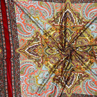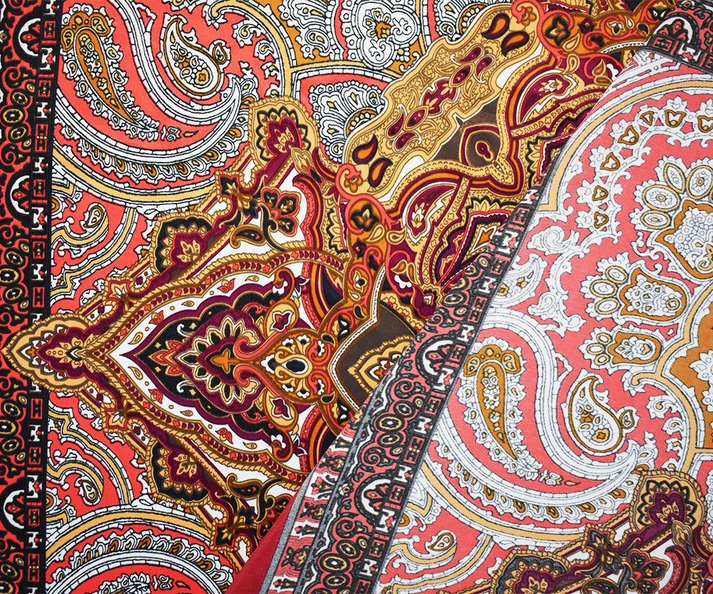 -Red-Orange-Multi Polyester Paisley Bandana PANEL Printed Charmeuse Woven Fabric