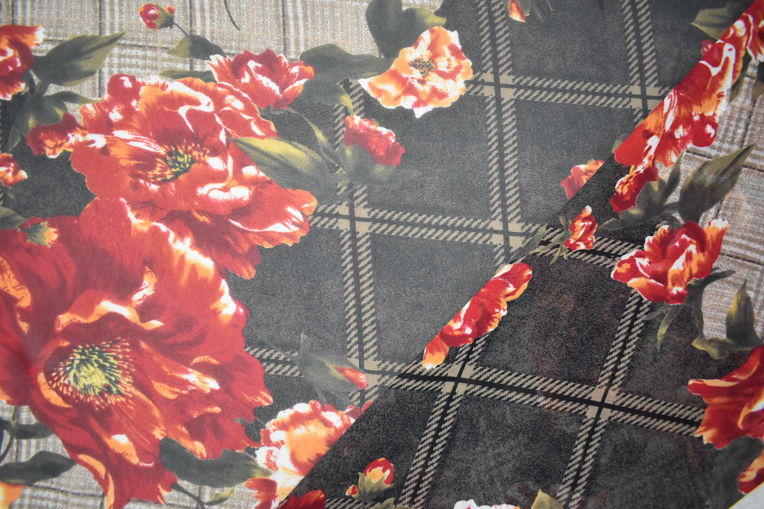-Beig-Red-Multi Poly Plaid Floral Printed Chiffon Woven Fabric
