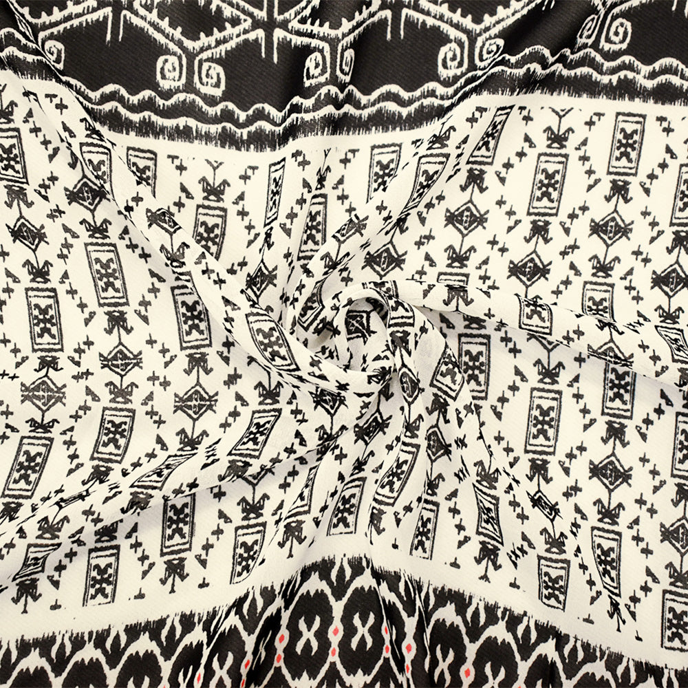 Black-Off-White-Orange Poly Aztec Striped Printed Chiffon Woven Fabric