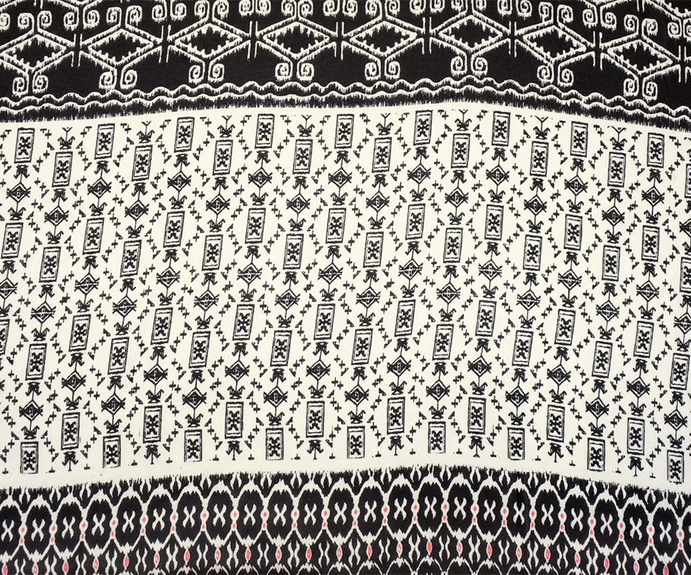 -100% Polyester chiffon woven fabric printed with an Aztec inspired pattern in a stiped arrangement