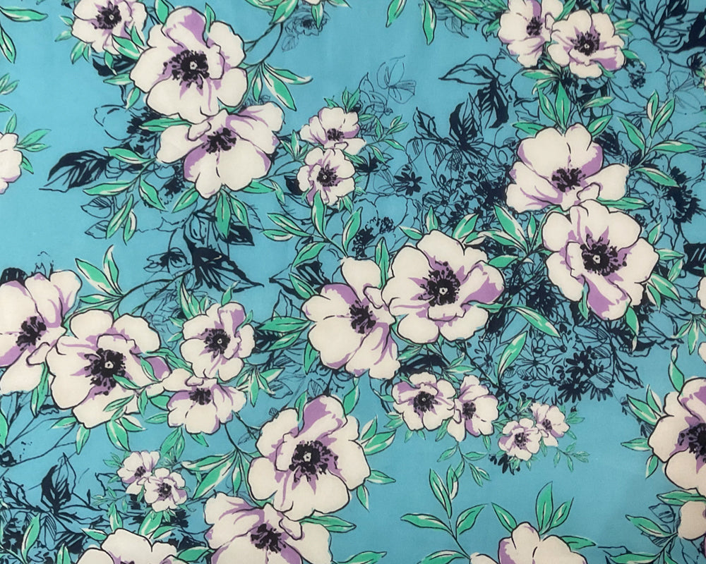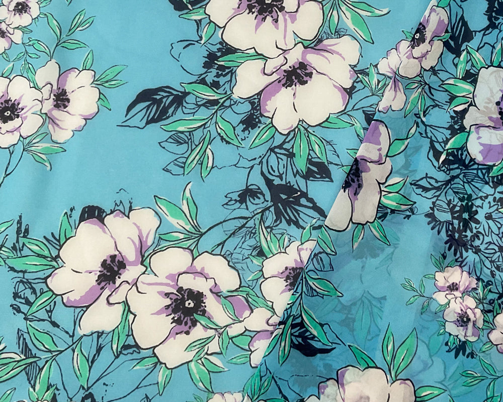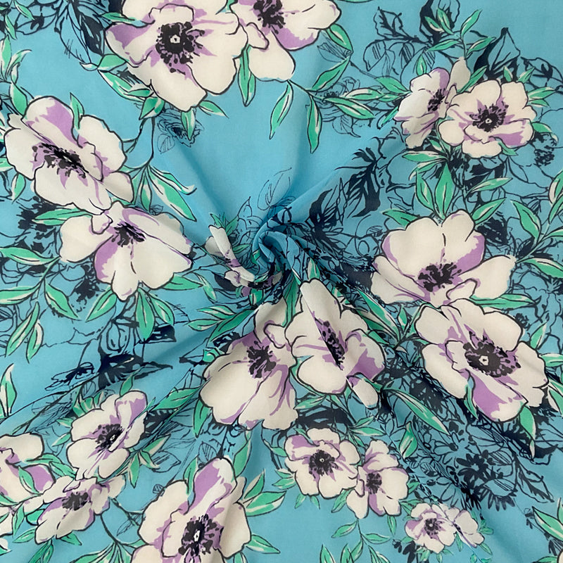 Blue-Green-Multi Poly Floral Printed Chiffon Woven Fabric