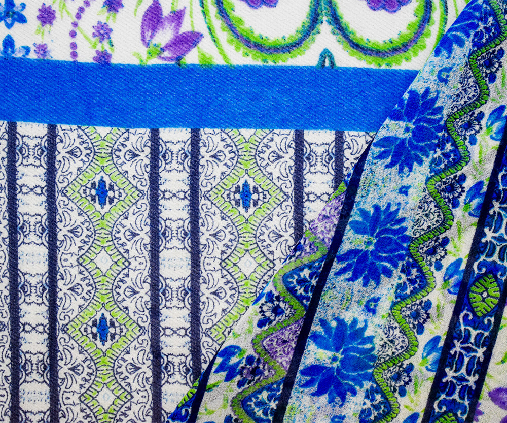 Blue-Purple-White Multi Pattern Floral Stripe Print Chiffon Woven Fabric
