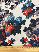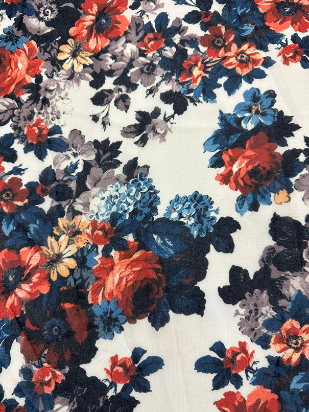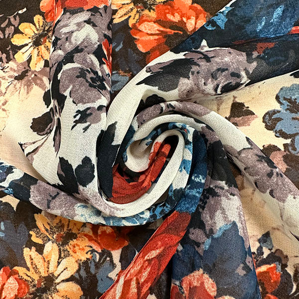 -Blue,vRed, Taupe, Orange, & Black Floral Print on Ivory Sheer Poly Chiffon Fabric