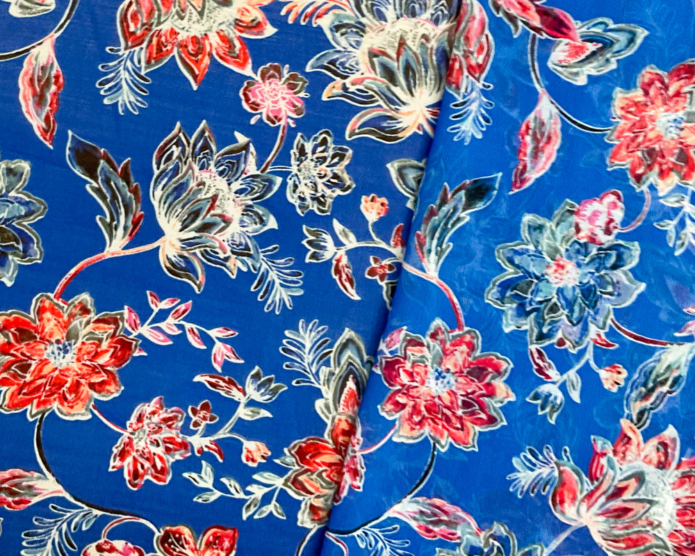 -Blue-Red-Multi Poly Floral Printed Chiffon Woven Fabric