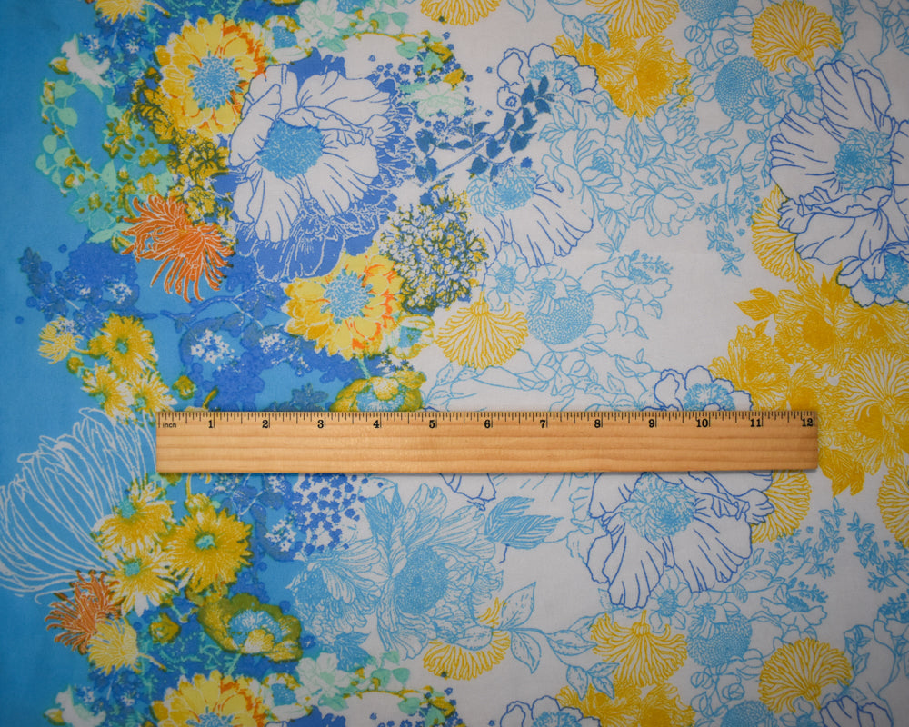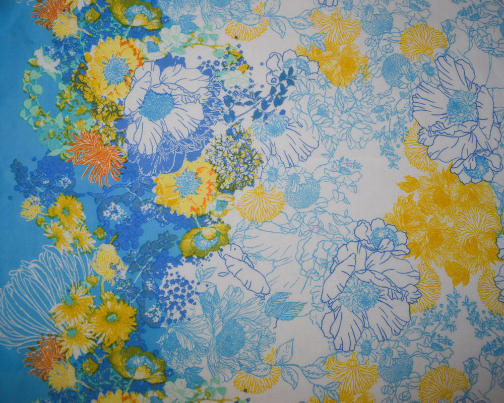 -Blue-White-Multi Poly Floral Border Printer Chiffon Woven Fabric