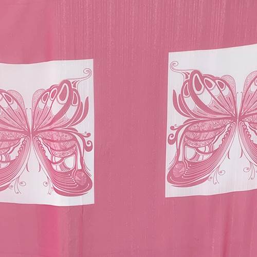 Deep pink and white printed polyester chiffon. Each PANEL is 58" Wide and 33" Long, and has 2 squares with a butterfly in each box. Each box has a 9 1/2" separation, and has silver vertical streaking throughout. -Weight: Tissue weight -Transparency: Sheer -Hand: Dry -Stretch: No Stretch -Drape: Good -Luster: Matte -End Uses: blouses, dresses, skirts, overlays and more. Compare to $12.00/yd 100% Polyester