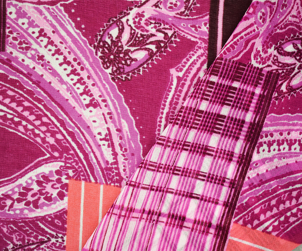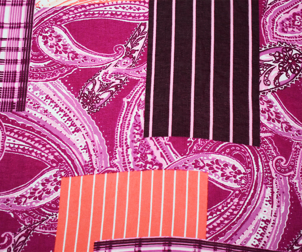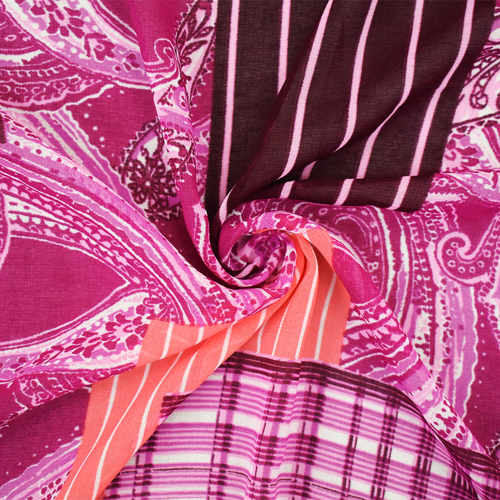 -100% Polyester chiffon woven fabric printed with multi patches featuring stripes, paisley, and abstract plaid designs.