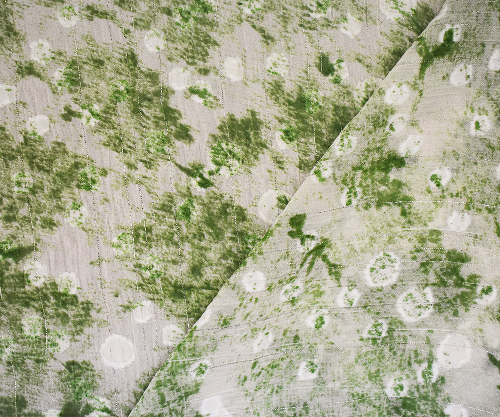 Green-White-Silver Texture Print Poly Metallic Stripe Yoryu Chiffon Fabric