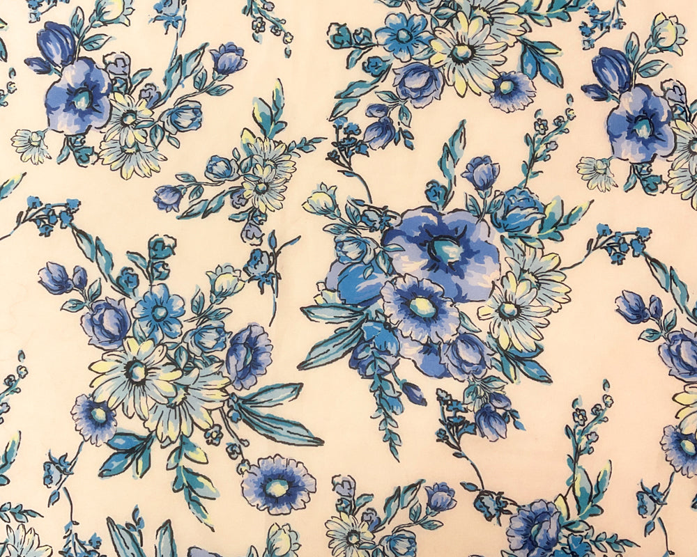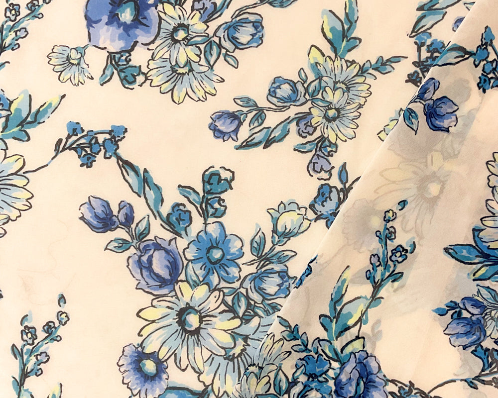 -Ivory-Blue-Multi Poly Floral Printed Chiffon Woven Fabric