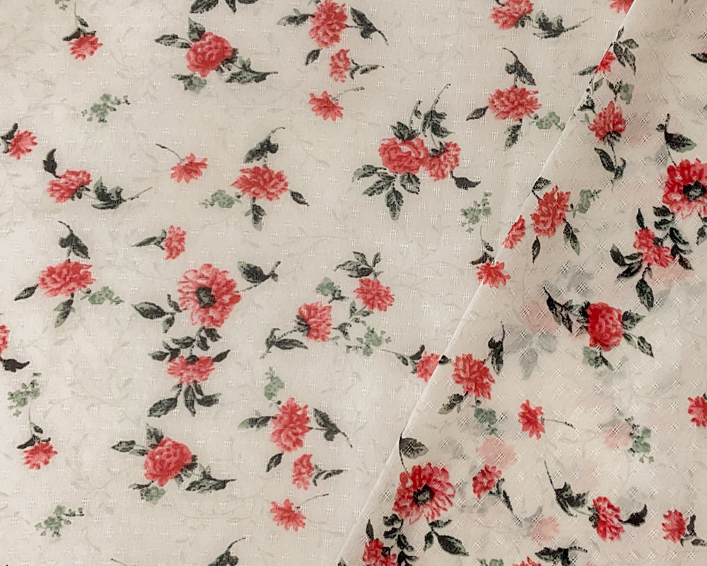 Ivory-Green-Multi Poly Floral Printed Dobby Chiffon Woven Fabric