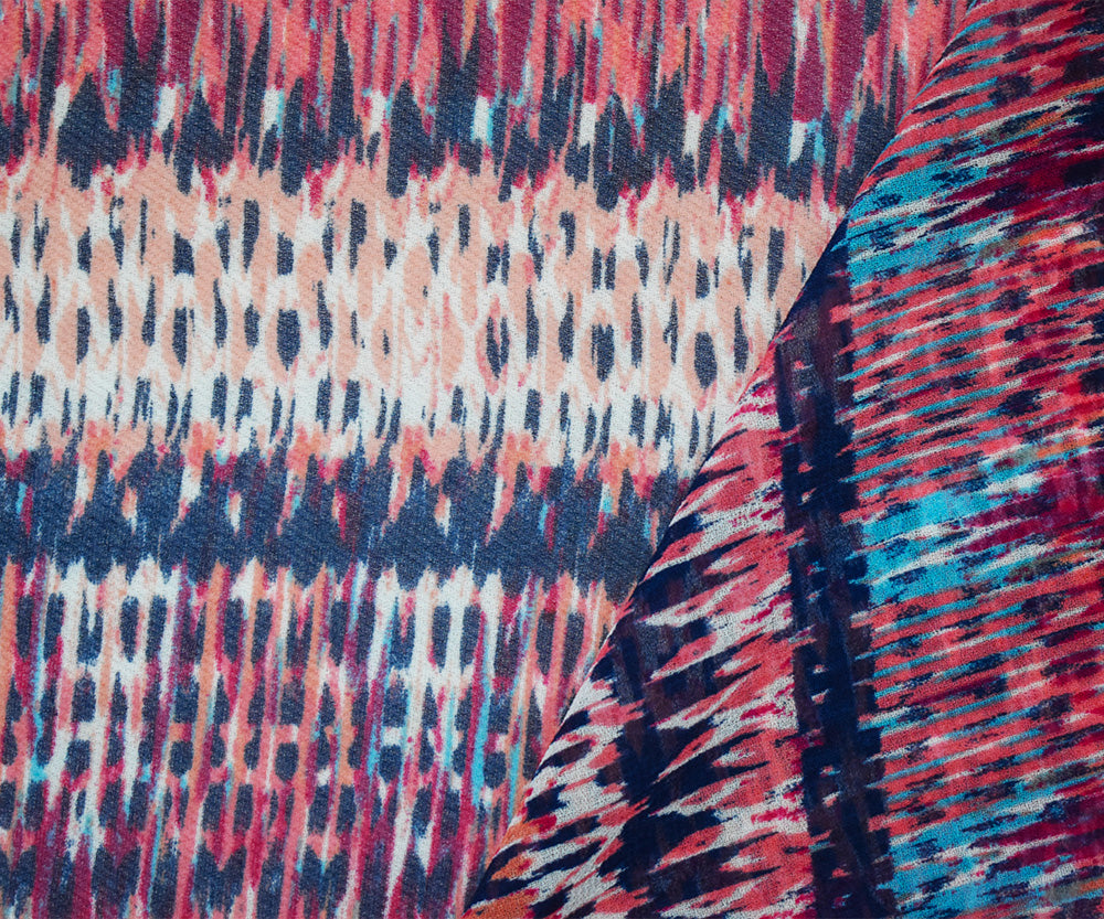 -100% Polyester chiffon printed with an Aztec inspired ikat-like pattern