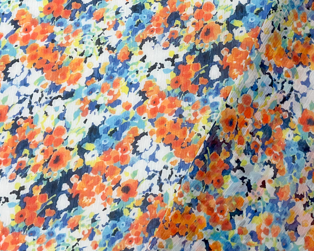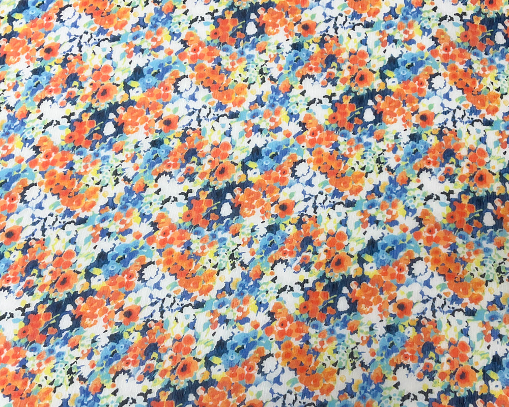 -Orange-Blue-Multi Poly Floral Printed Crinkle Yoryu Chiffon Woven Fabric