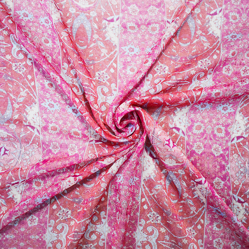 Pink-Blue-Multi Poly Stripe Floral Printed Crinkle Yoryu Chiffon Woven Fabric
