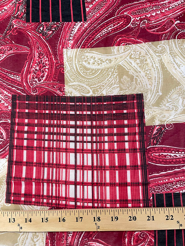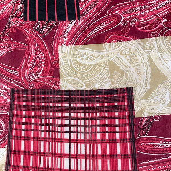 -Red, Black, White, Beige, & Cream Paisley & Stripe Patchwork Print Sheer Chiffon Fabric