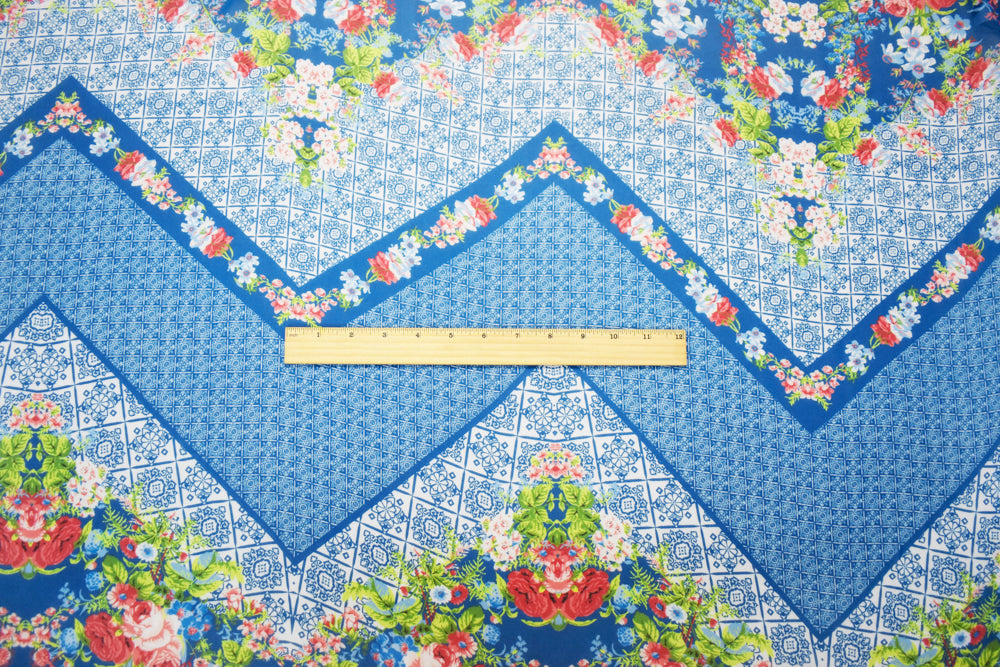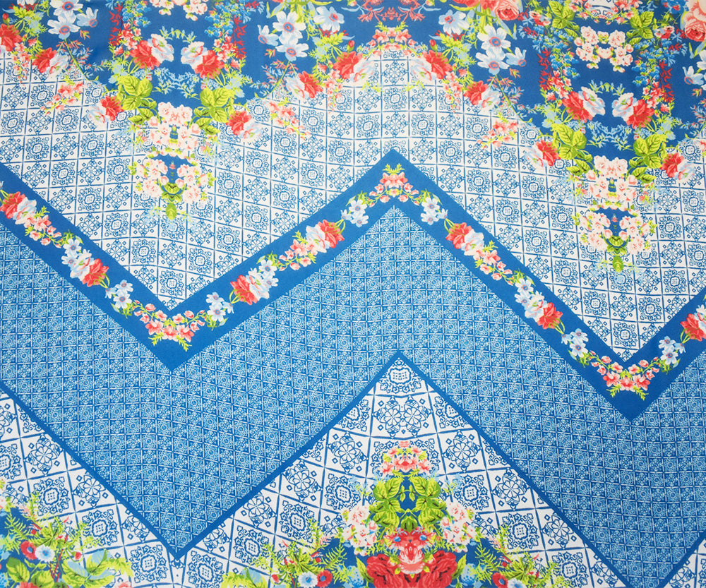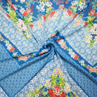 -Teal Blue-Orange Multi Poly Floral Border Printed Chiffon Woven Fabric