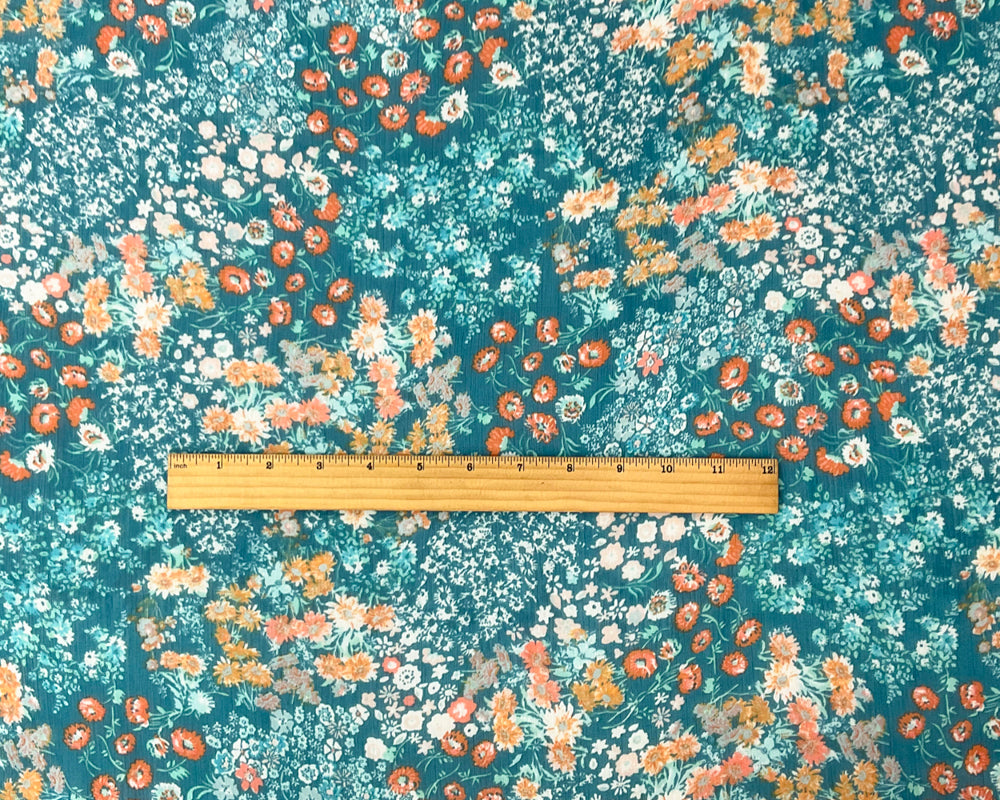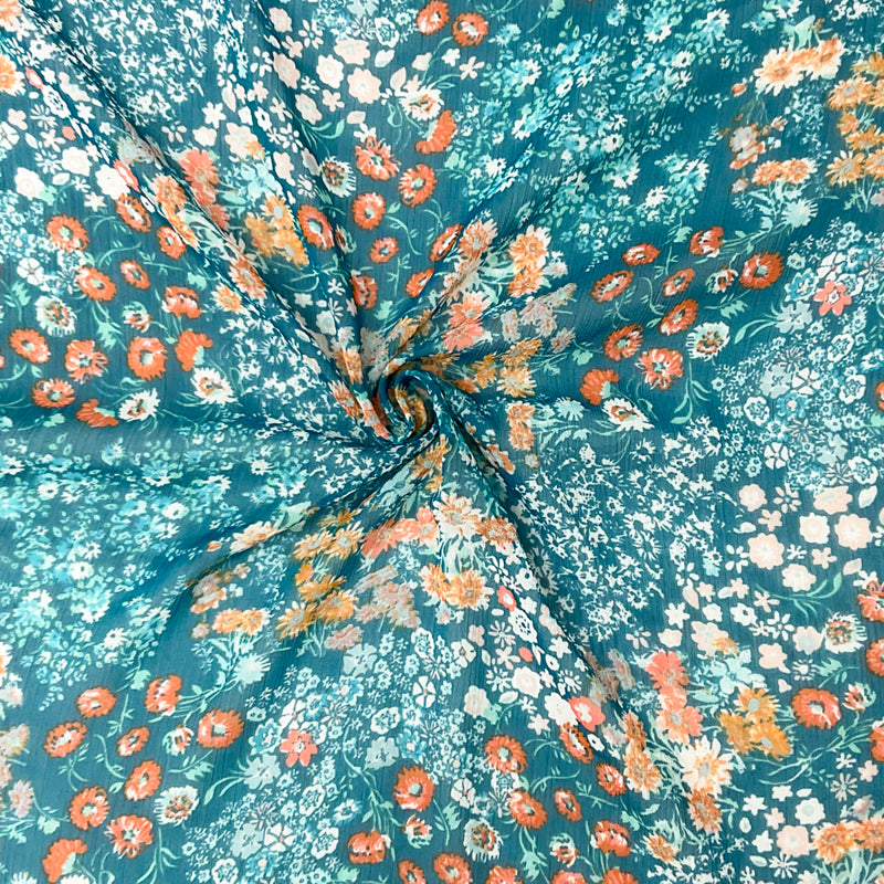 Teal-Multi Poly Floral Printed Crinkle Yoryu Chiffon Woven Fabric
