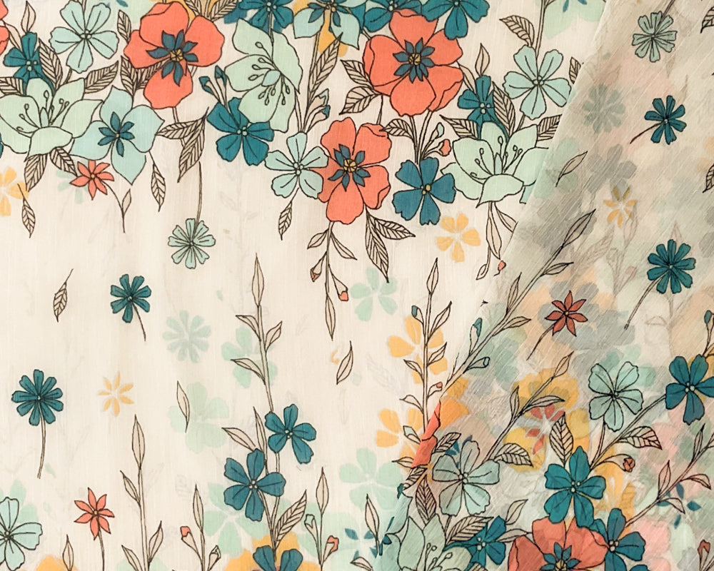 Teal-Multi Poly Floral Printed Crinkle Yoryu Chiffon Woven Fabric
