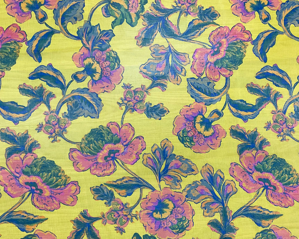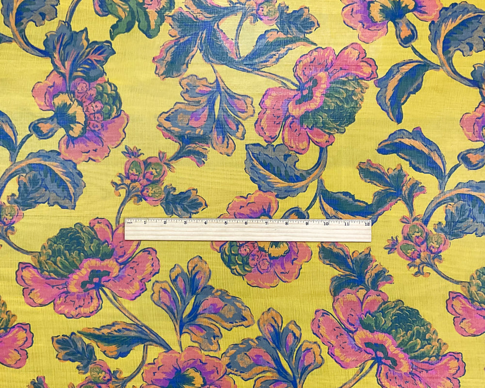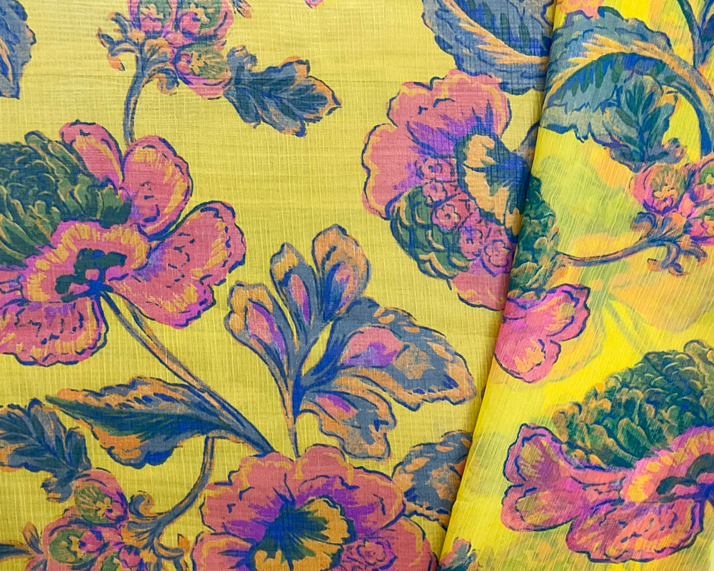 Yellow-Pink-Multi Poly Floral Printed Crinkle Yoryu Chiffon Woven Fabric