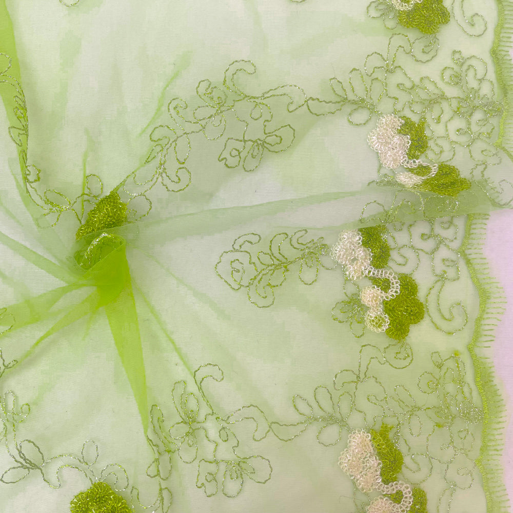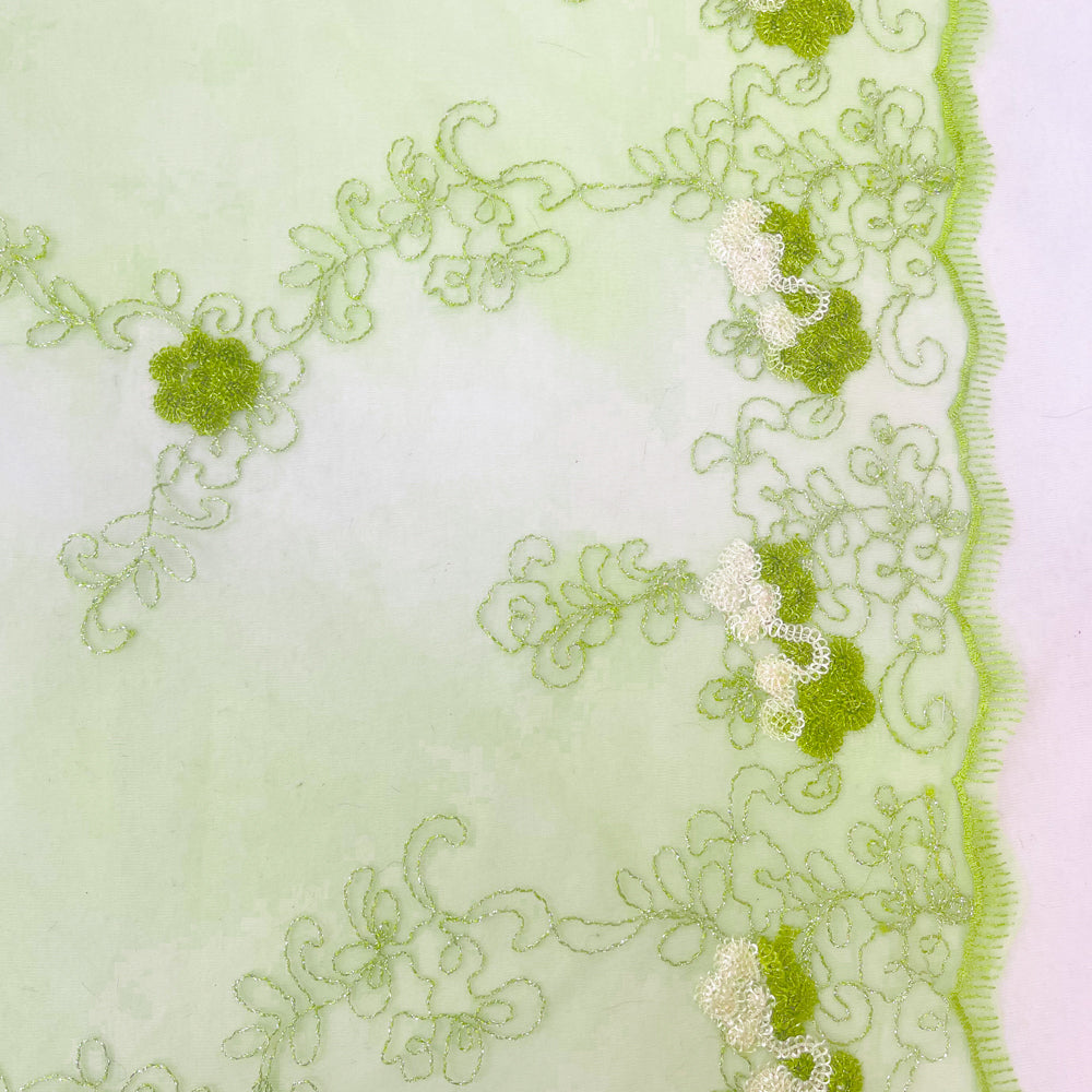 Green-Silver-Ivory Nylon Metallic Floral Embroidery Scallop Mesh Tulle Fabric