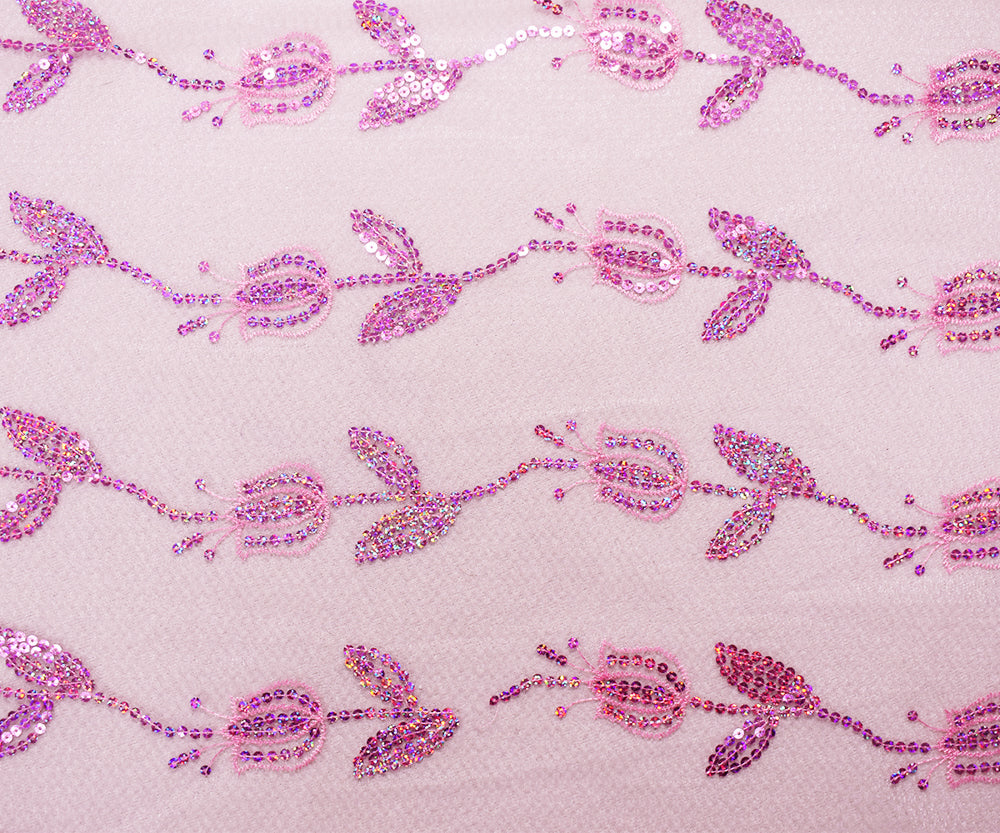 Pink Nylon Embroidered Floral Tullip Sequin Scallop Tulle Mesh Fabric