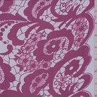 White background with a floral lace print in fuschia. This very lightweight sheer silk fabric has great flow and drapability.