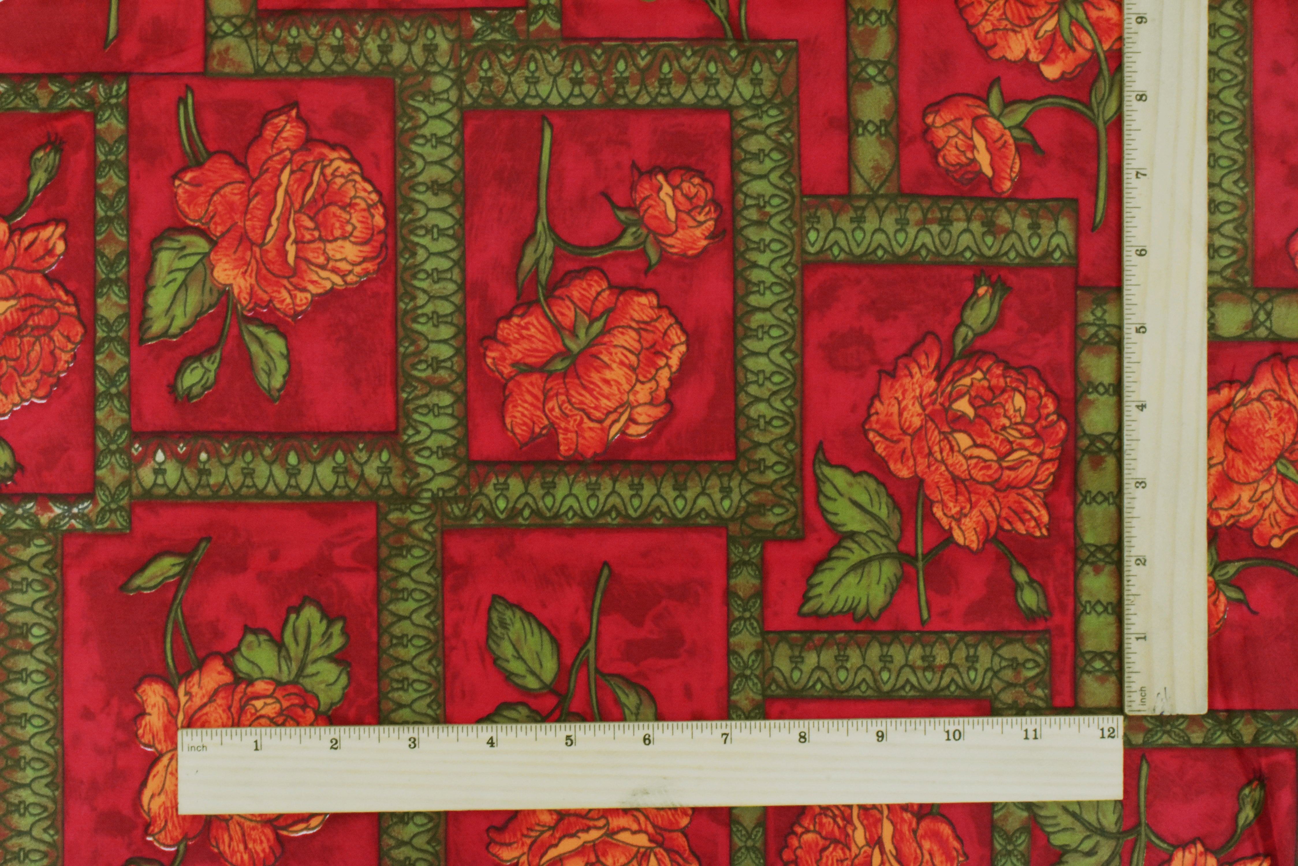 Cherry Red-Green-Multi Floral Frame Printed Cotton Sateen Fabric