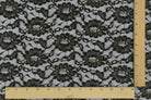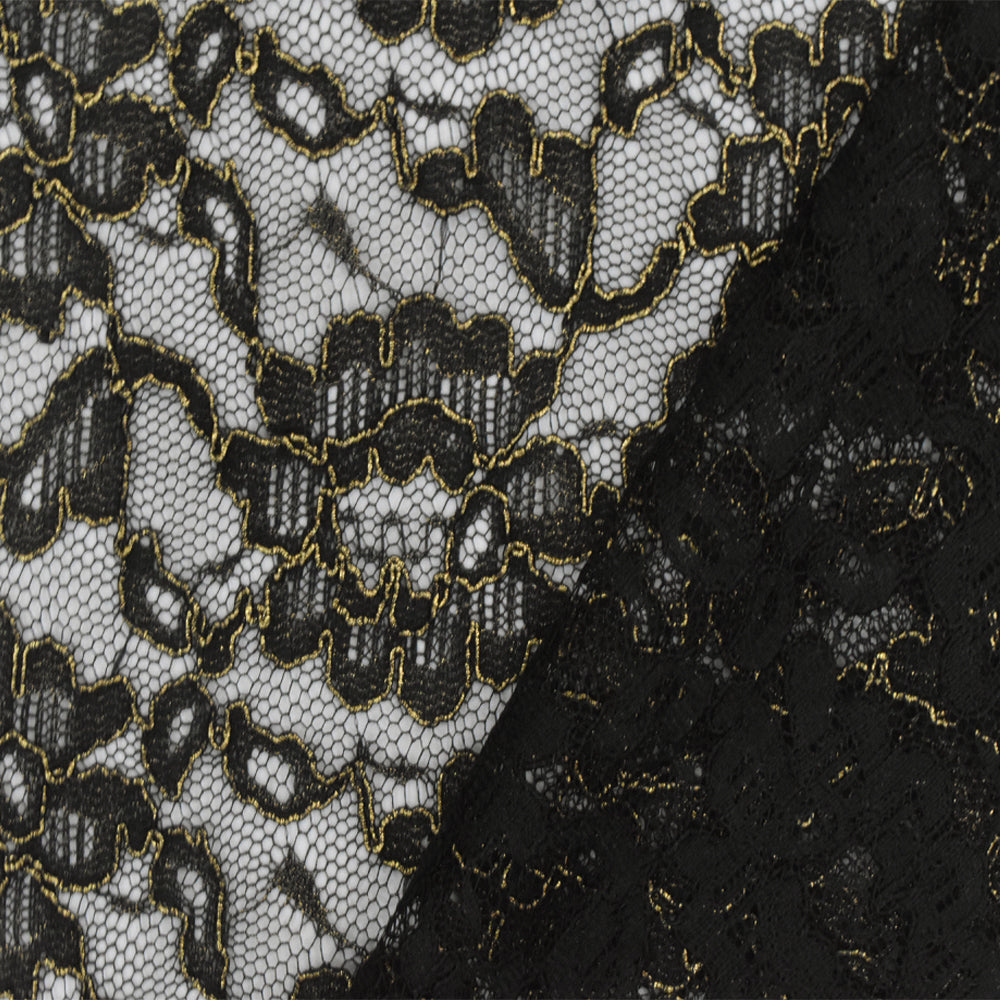 -Black floral knit lace fabric overprinted with a metallic gold pattern for that added luster