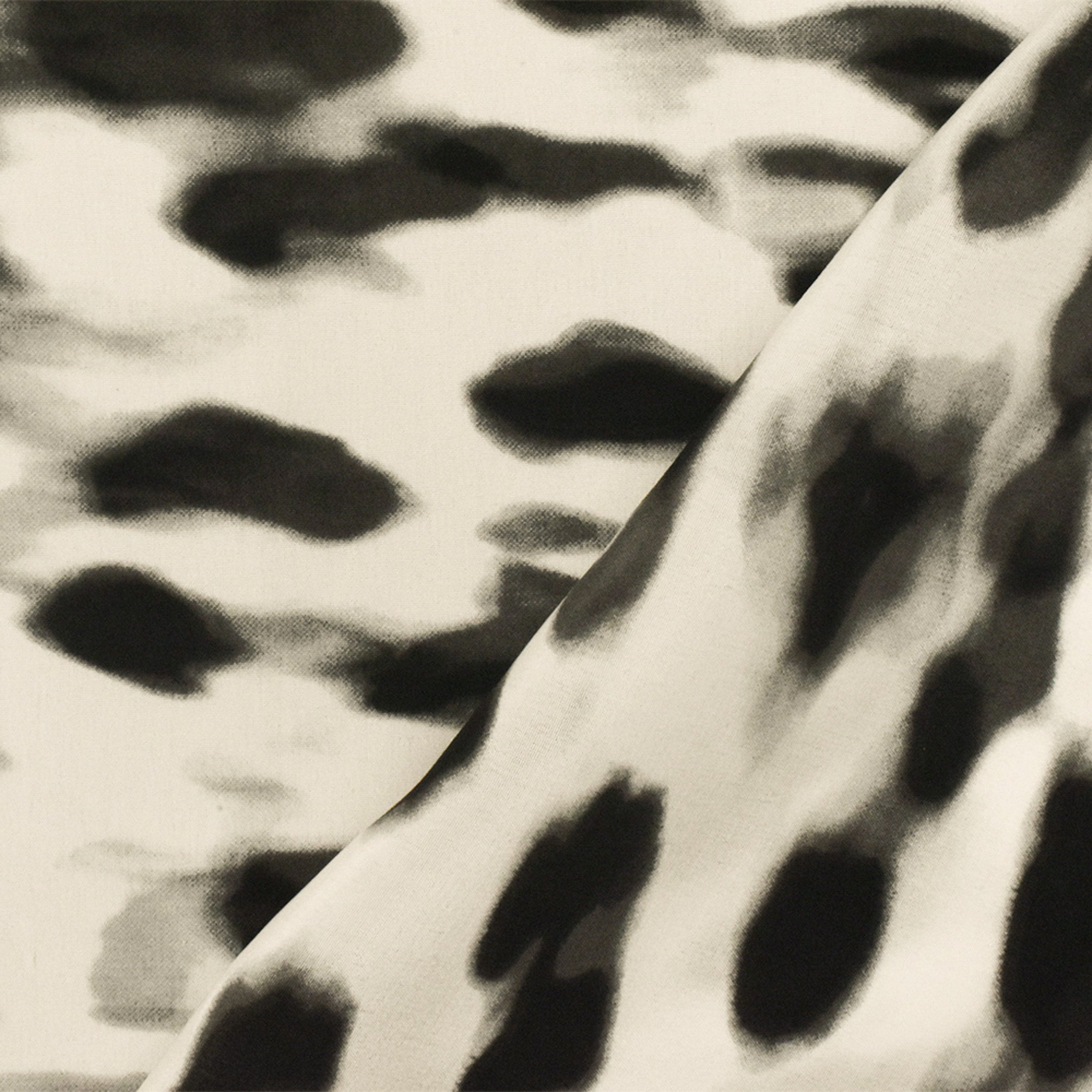 -12 mm, famous designer 100% silk crepe de chine printed with an abstract water color stylized animal print pattern. Line if needed.
