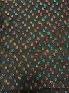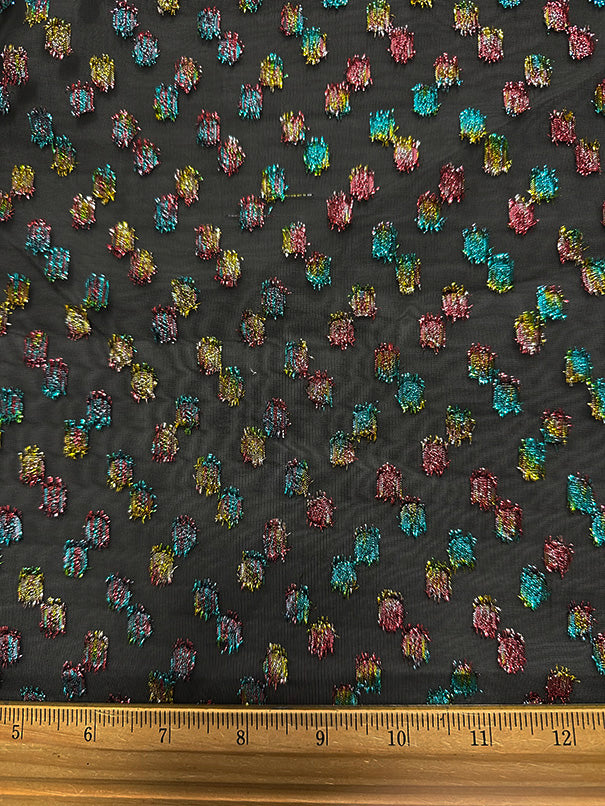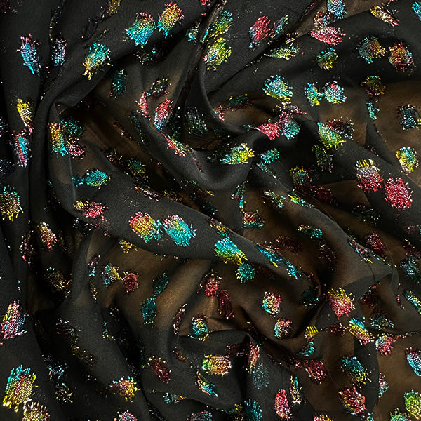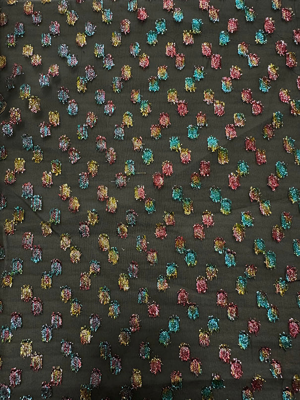 -Metallic Gold, Turqoise, & Pink Clips on Black Poly Chiffon Fabric