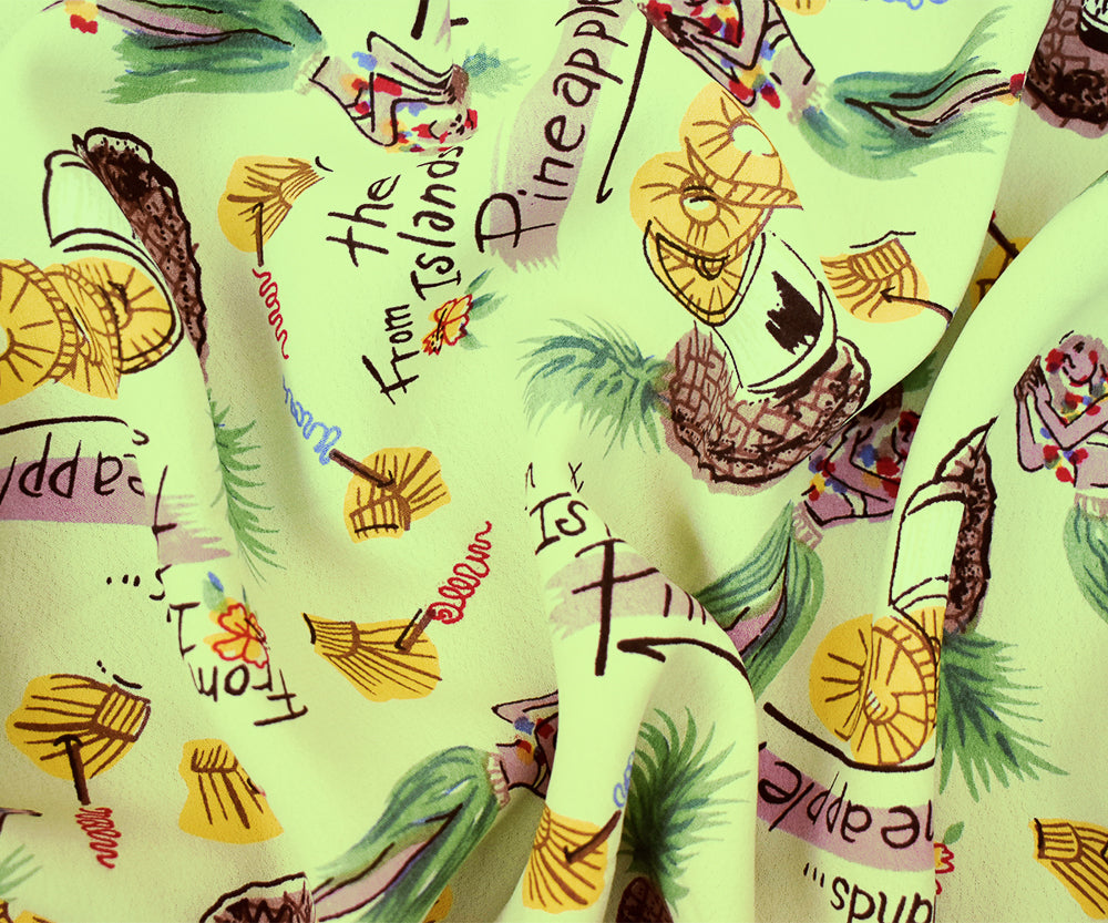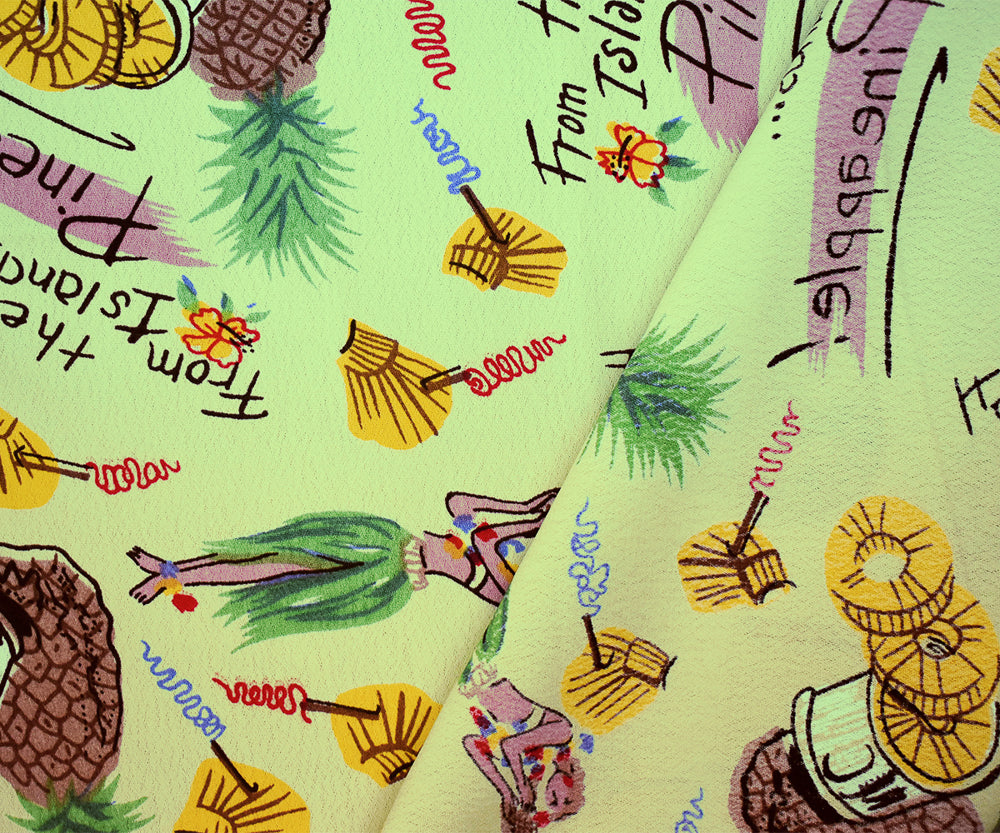 -100% rayon crepe faille woven fabric printed with a Hawaiian themed pattern. Line if needed.