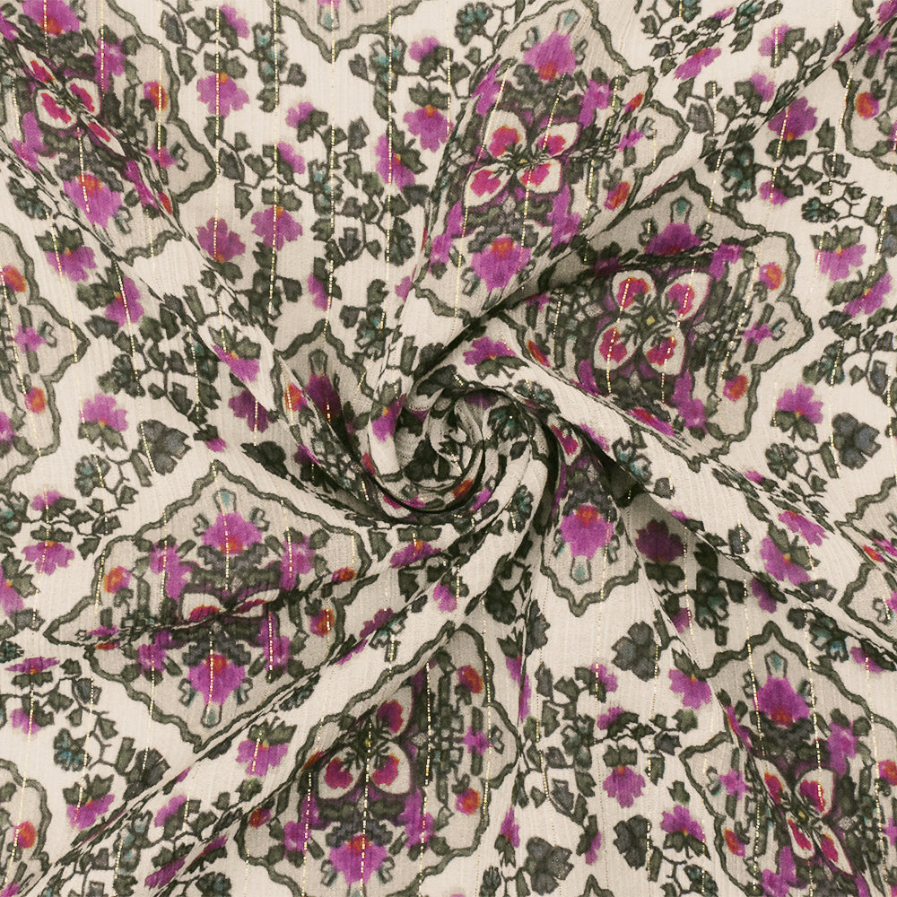 -Famous designer Viscose, silk, & metallic blend crinkled chiffon woven fabric printed with a Moroccan inspired pattern