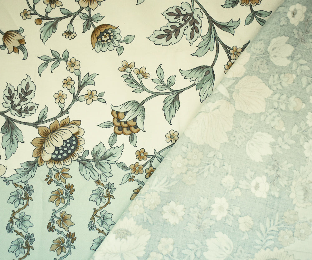 -100% cotton sateen woven fabric printed with a stylized floral pattern with bordered design on each selvedge.