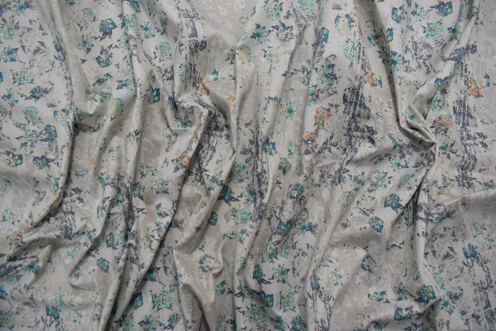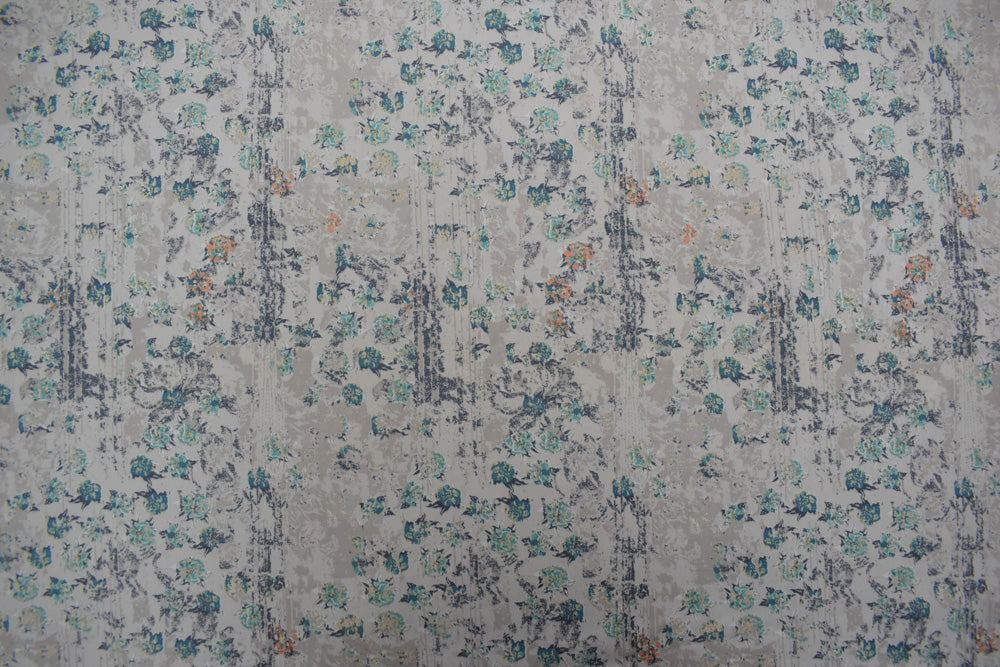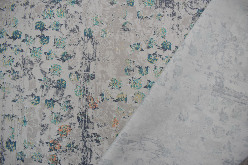 Teal-Multi Cotton Floral Texture Printed Stretch Twill Sateen Woven Fabric
