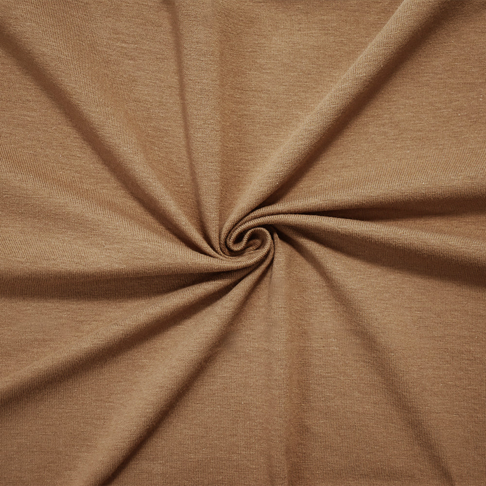 -Top quality medium weight cotton spandex knit in an on trend season perfect neutral shade of mocha brown solid color. True medium weight 10 oz with a soft hand, great 4 way stretch, and nice recovery. A versatile fabric great for many different uses!