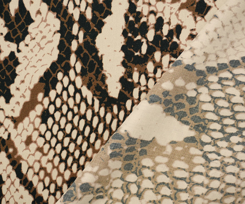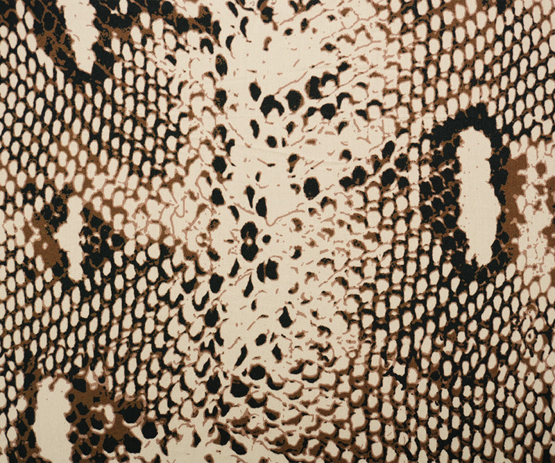 -This rayon fabric features a reptile print on a smooth twill satin weave, creating a lustrous and luxurious hand. The combination of dramatic pattern and elegant drape makes it ideal for evening wear and statement apparel.