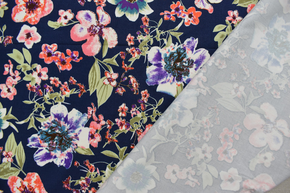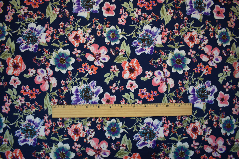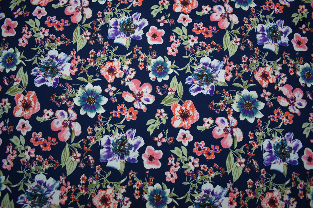 Navy-Multi Cotton Floral Printed Stretch Spandex Twill Sateen Woven Fabric