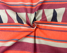 -100% cotton twill woven fabric printed with a tribal inspired pattern featuring horizontal stripes, textured-like surface, and triangles.