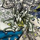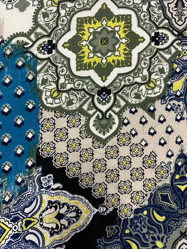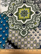 -Teal, Lime, Green, White, Black, Teal Blue, & Beige Multi Medallion Print High Crepe Fabric