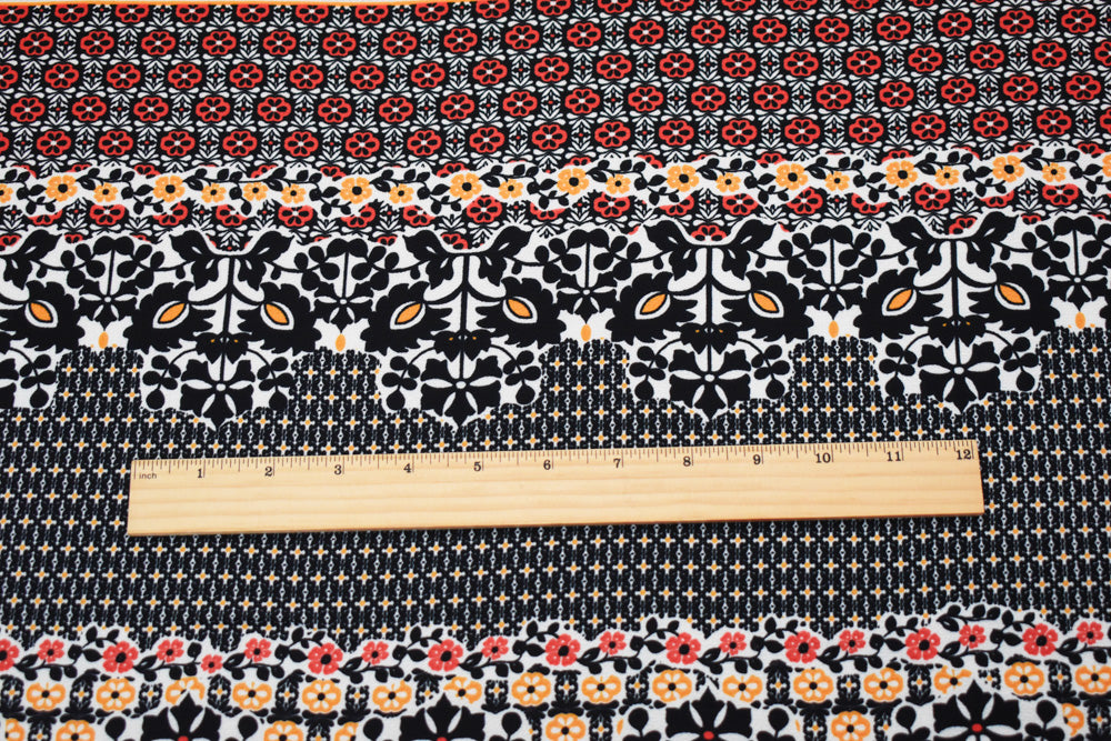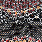 Black-Orange-Multi Poly Floral Border Printed Pebble Crepe Woven Fabric