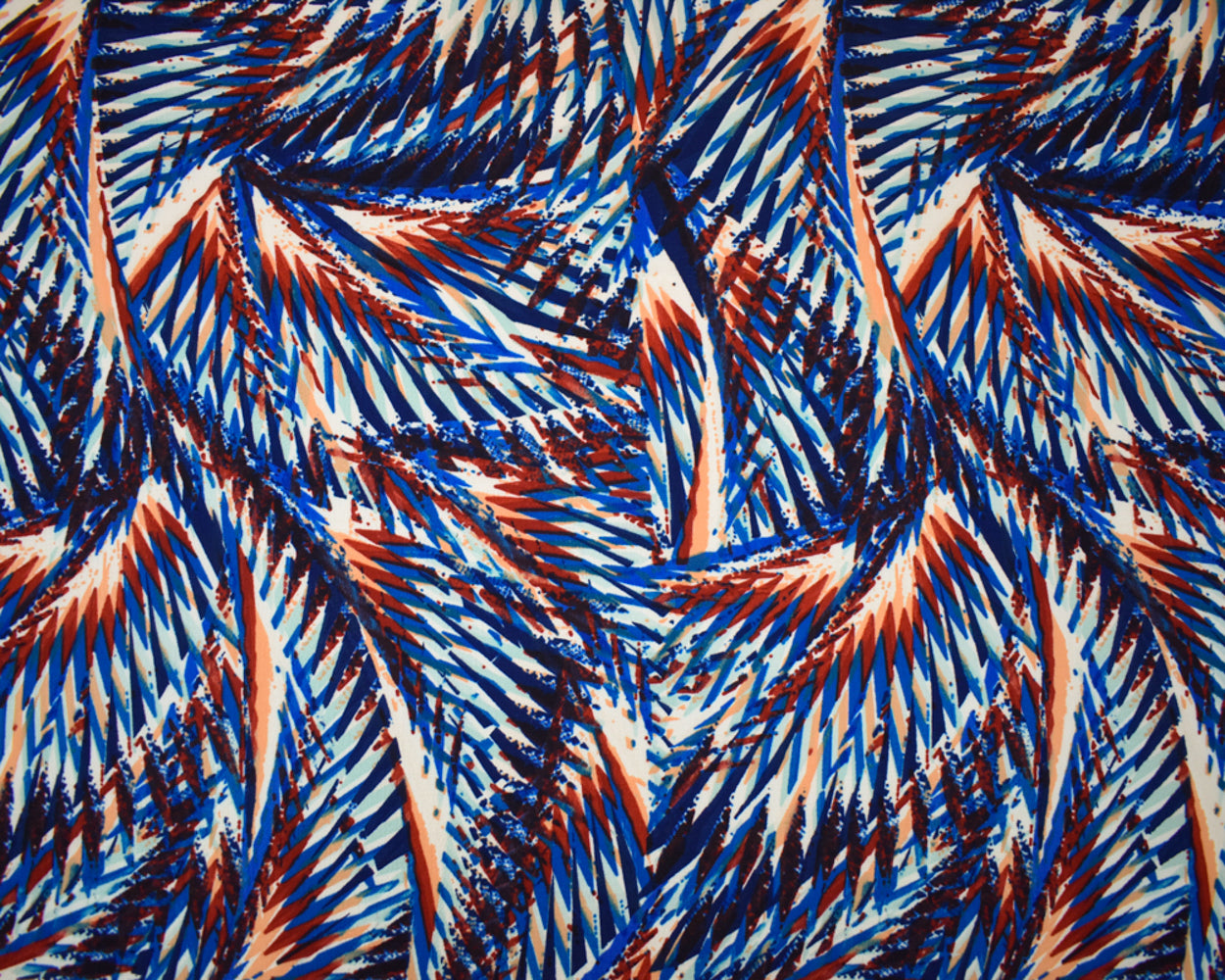 -Blue- Red-Multi Poly Abstract Palm Tree Printed Pebble Crepe Woven Fabric