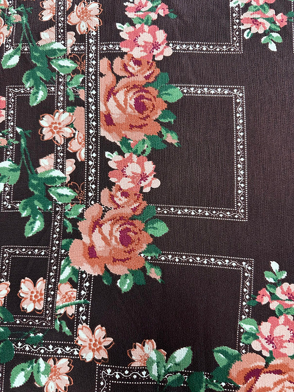 -White, Green, Peach, Pink, Orange, & Gold Floral and Trellis Print on Brown Poly High Crepe Fabric