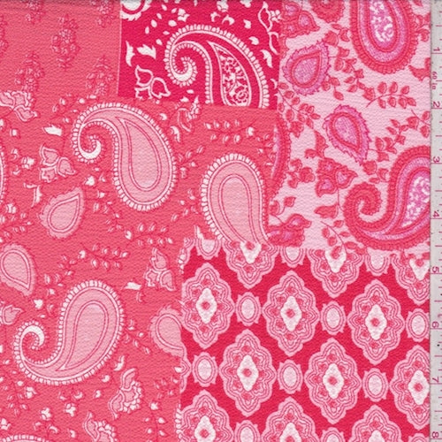 -Polyester crepe fabric printed with a patchwork block print with medallions, paisleys and flowers