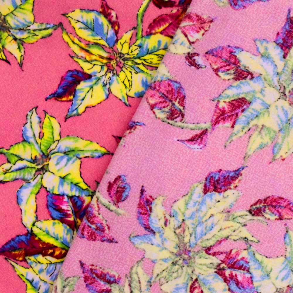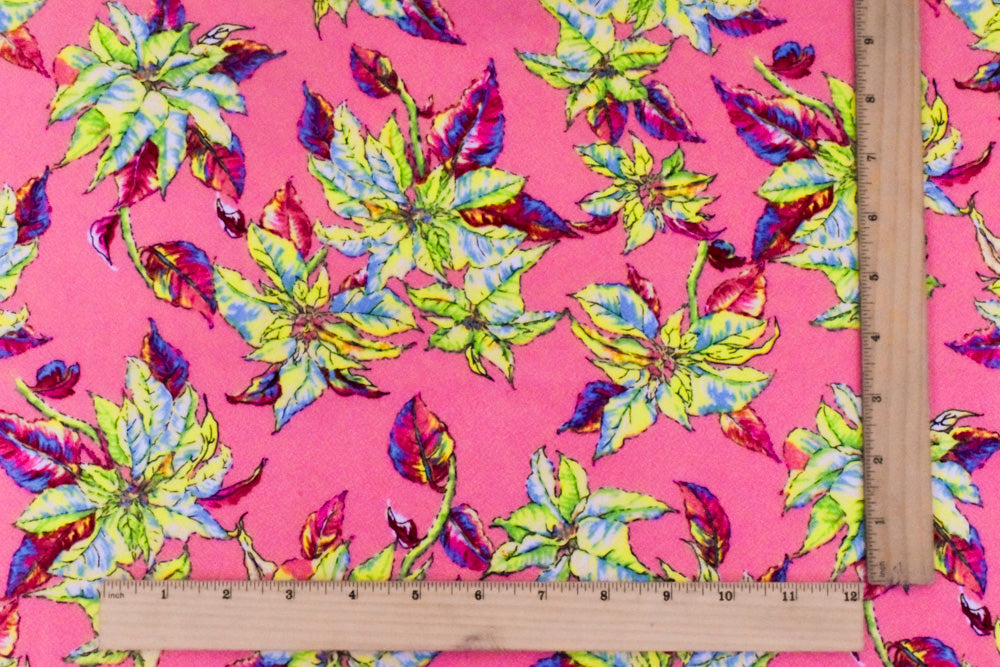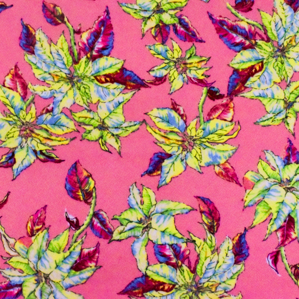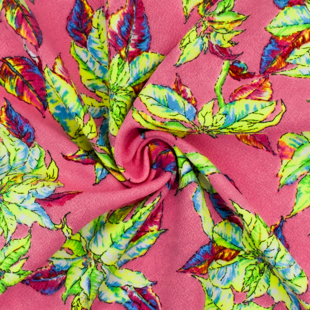 Kiss Pink-Yellow-Multi Leaves Printed Polyester Dobby Crepe Woven Fabric