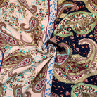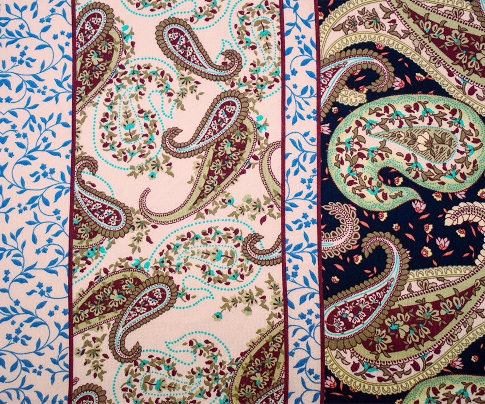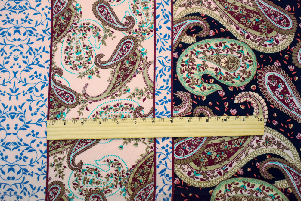 -100% Polyester pebble crepe woven fabric printed with a bordered paisley pattern and leaf motifs