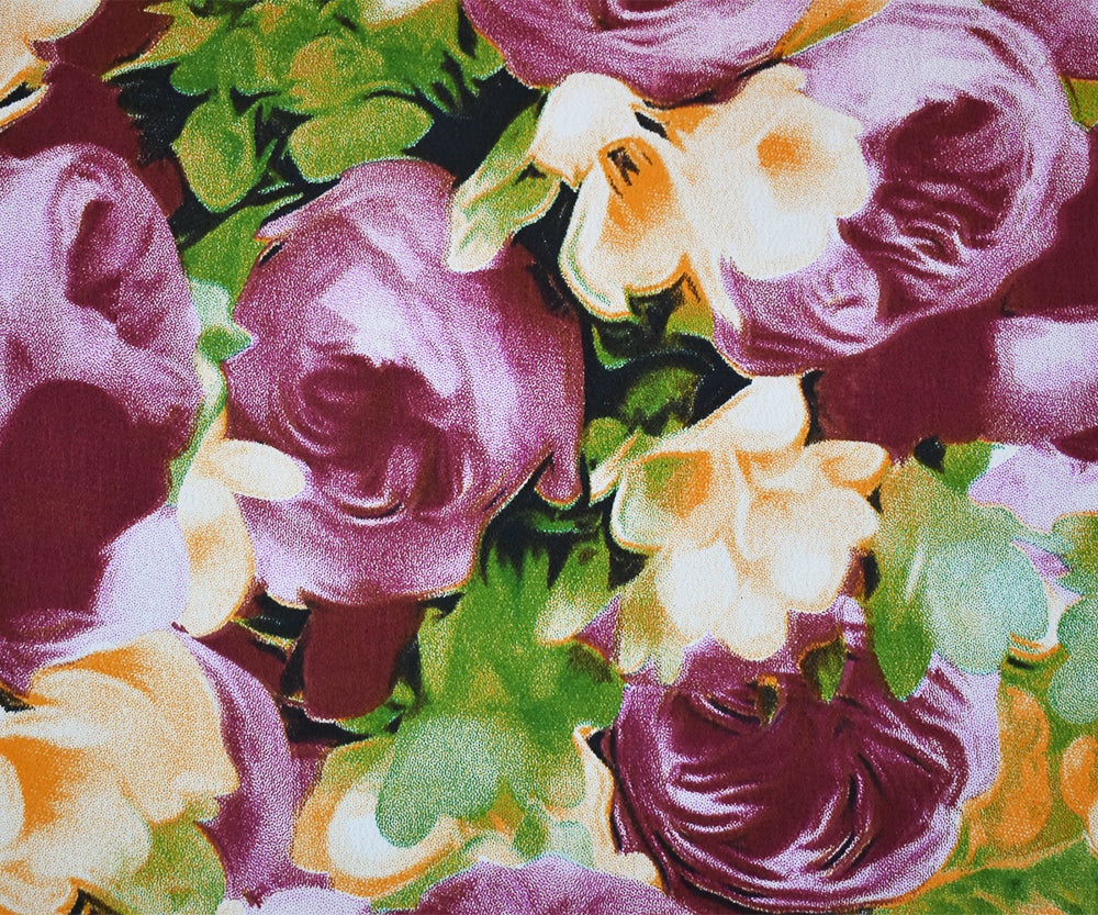 -100% rayon crepe faille woven fabric printed with a stylized floral pattern. Line if needed.