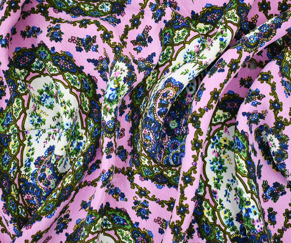-100% rayon crepe faille woven fabric printed with a trellis stylized pattern with florals and circular frame-like motifs. Line if needed.
