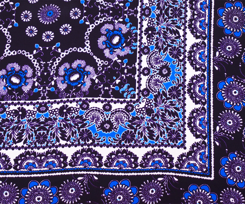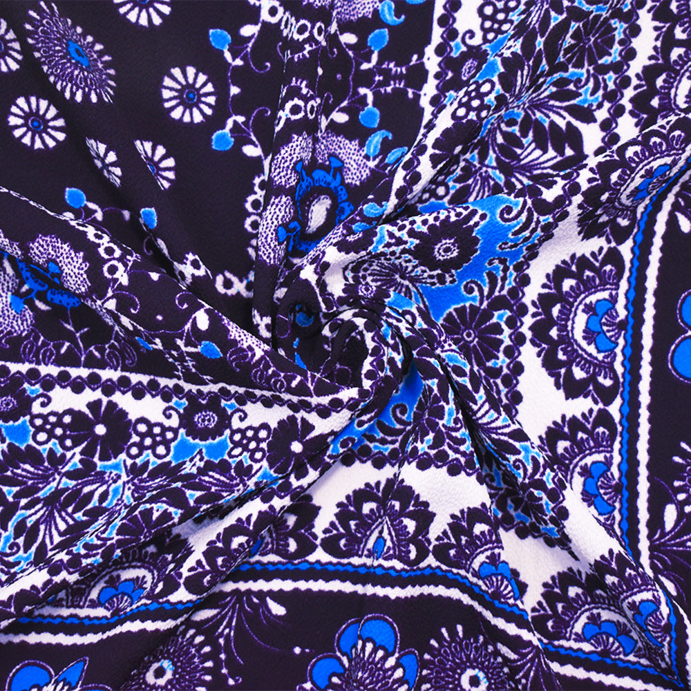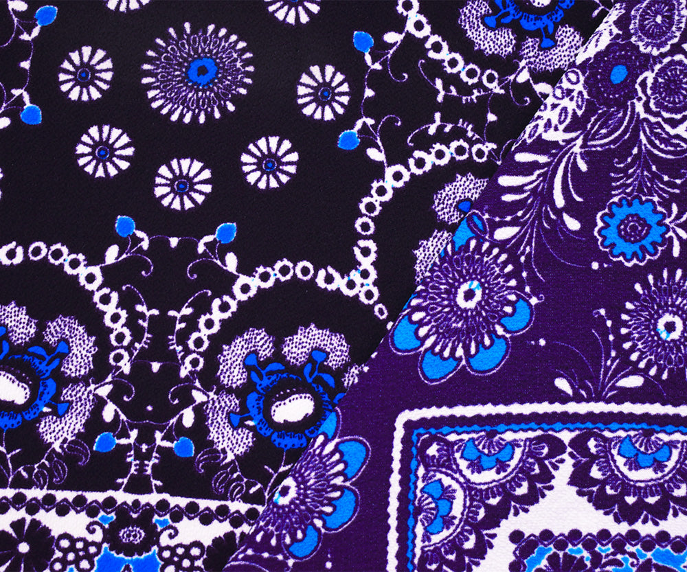 -100% Polyester pebble crepe woven fabric printed with a bordered style pattern with floral motifs. Line if needed.