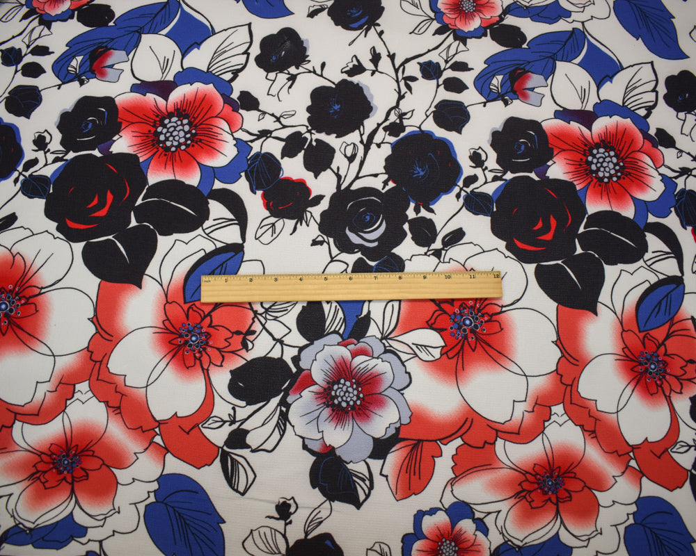 Red-Blue-Multi Poly Floral Printed Pebble Crepe Woven Fabric