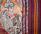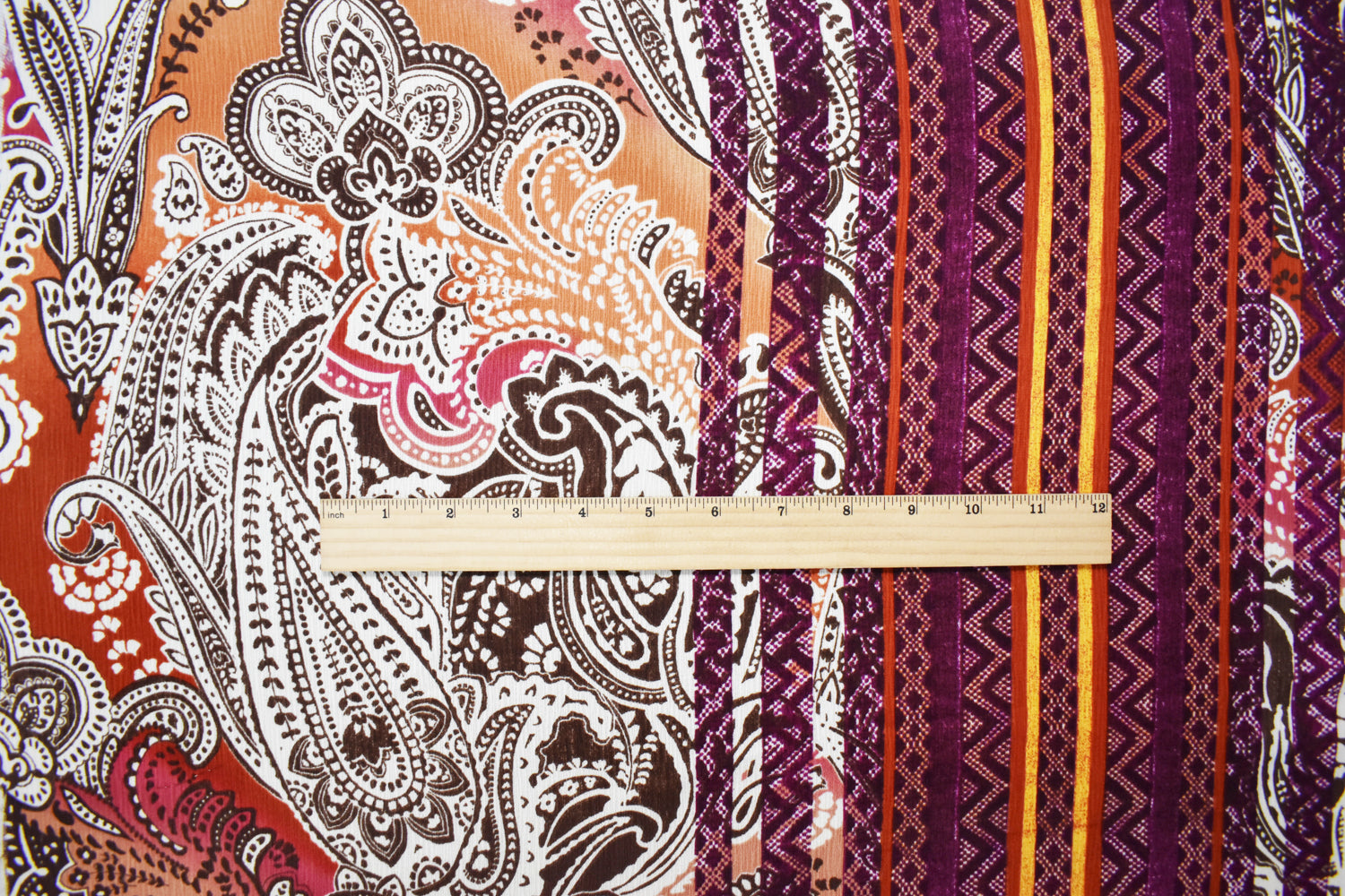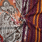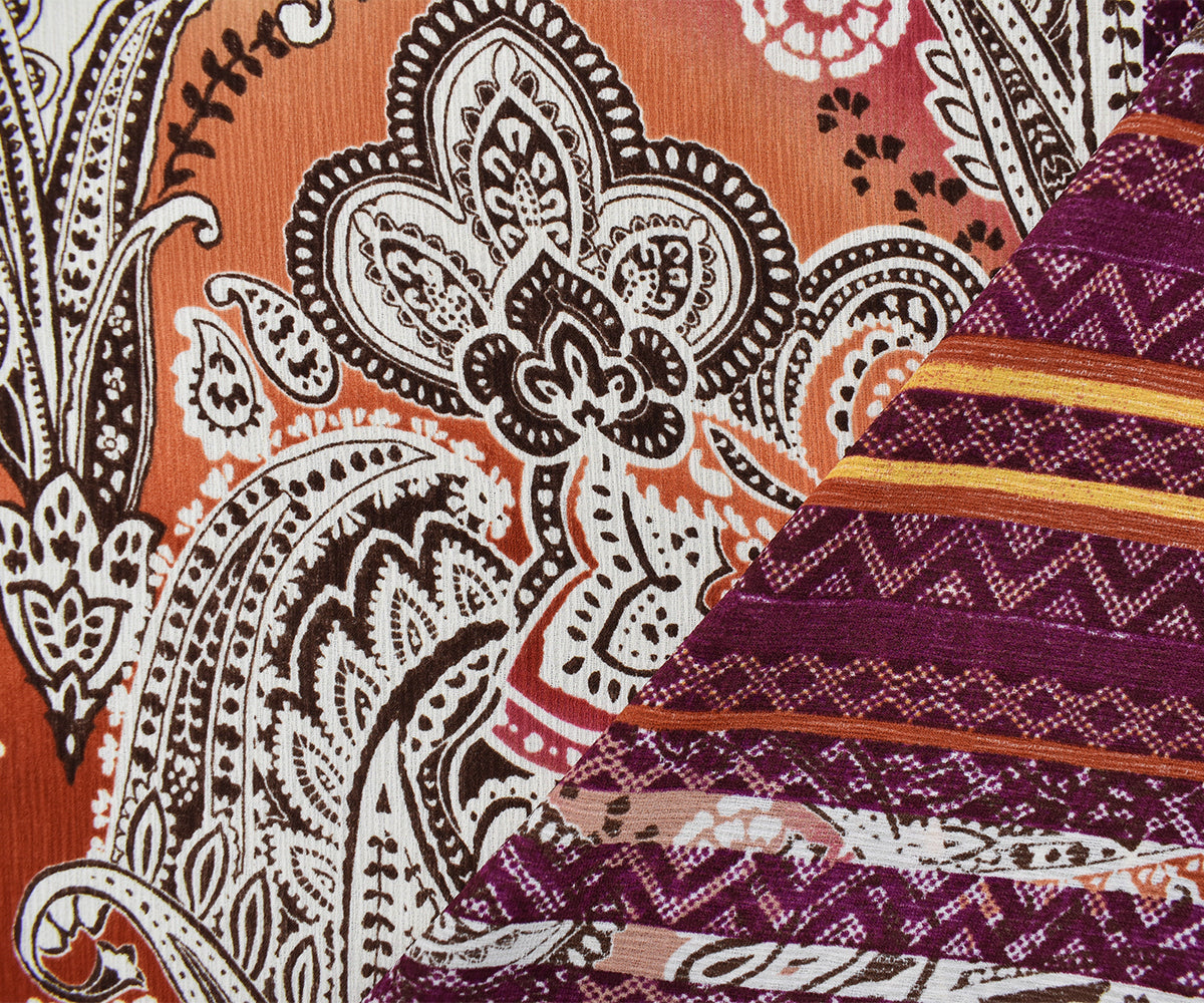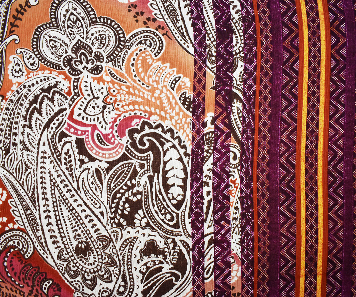 -100% polyester crinkled crepe woven fabric printed with a bordered style pattern with paisley, chevron, and Aztec inspired motifs.