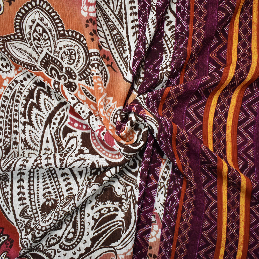 Red-Orange-Multi Poly Paisley Border Printed Crinkled Crepe Woven Fabric